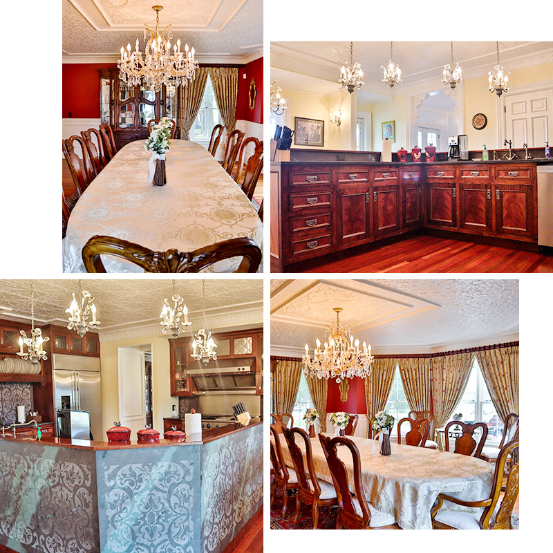 The elegant kitchen features a spacious floor plan with plenty of room for entertaining. The custom cabinets hand-crafted in Tiger Maple with rare Crotch Mahogany panels are set off by the slate counter-tops and hand-etched back-splash and trim. The custom breakfast table enjoys a lovely view of the grounds sloping to the orchard and lake-shore.